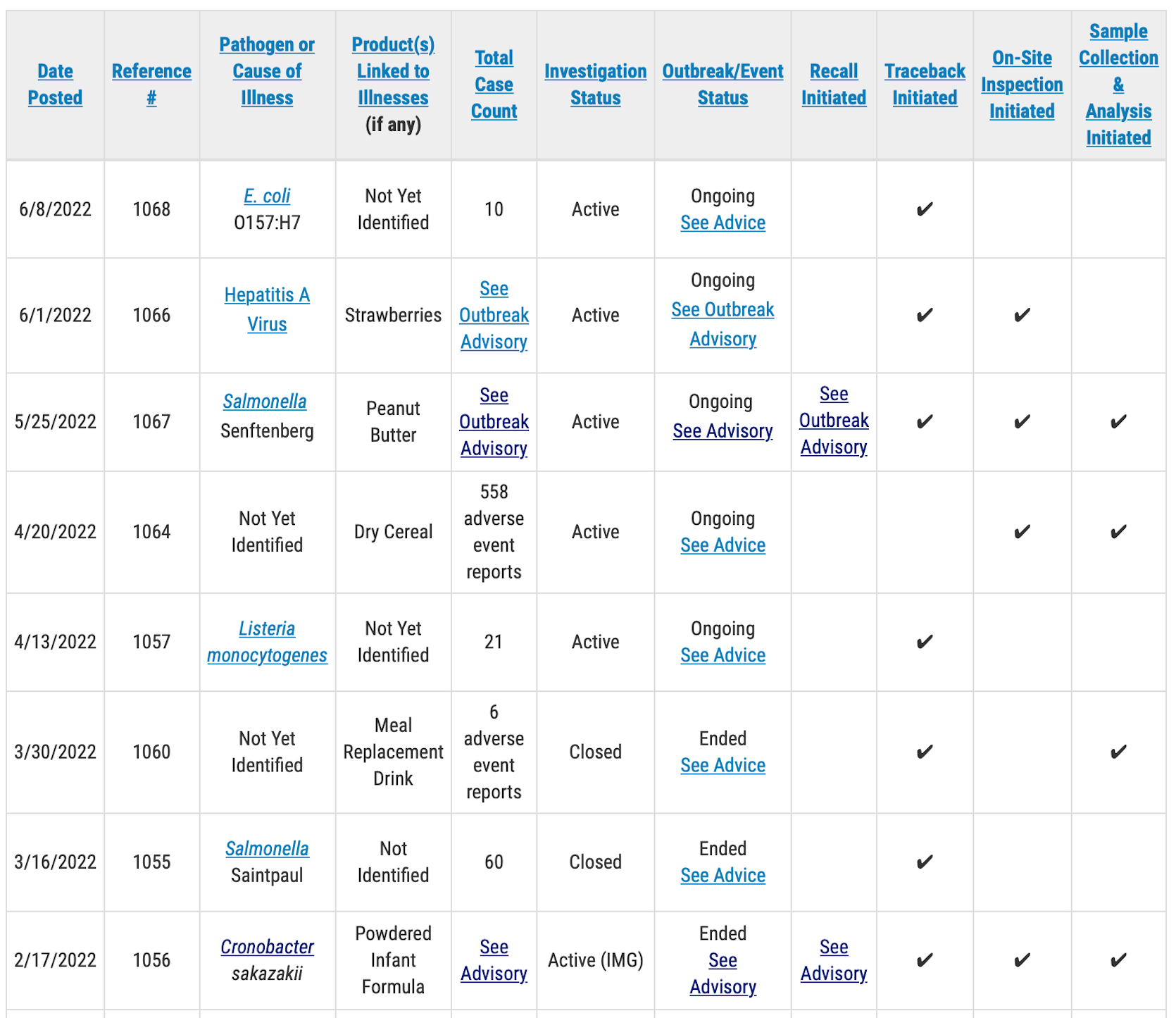 A public health advisory will be issued for investigations that have resulted in specific, actionable steps for consumers to take to protect themselves, according to the FDA. Please direct your attention to those pages for the most up to date information on the investigation and for consumer protection information.