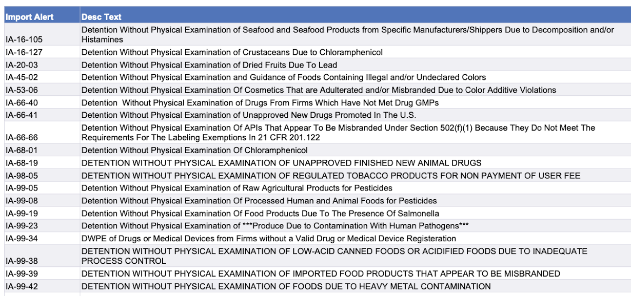 Recent modifications to FDA’s import alerts, as posted by the agency, are listed below. Click here to go to the FDA page with links to details on specific alerts.
