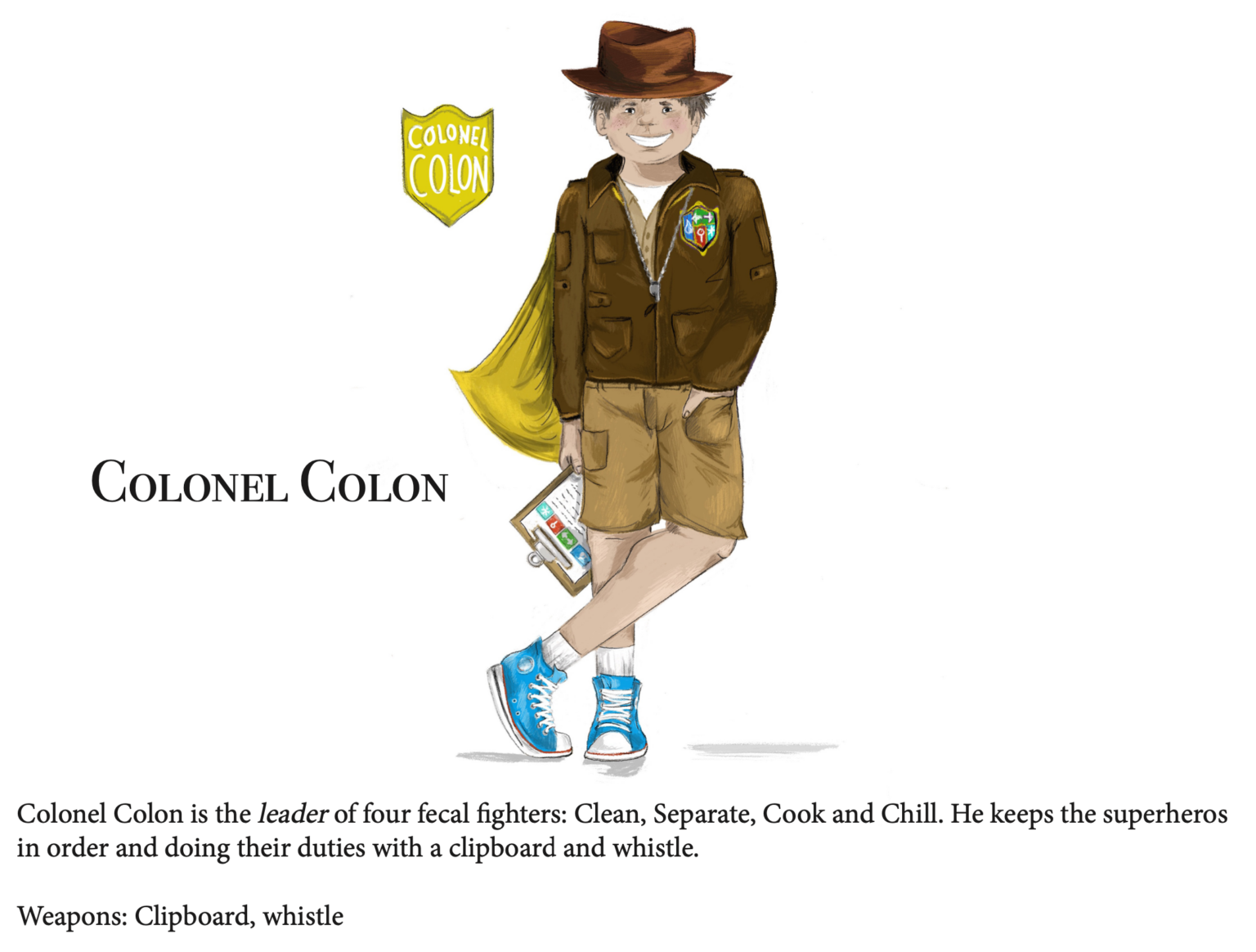 Colonel Colon (above) is the leader of four fecal fighters: Clean, Separate, Cook and Chill. Each is a superhero, but Clean, Separate, Cook and Chill have unique superpowers.