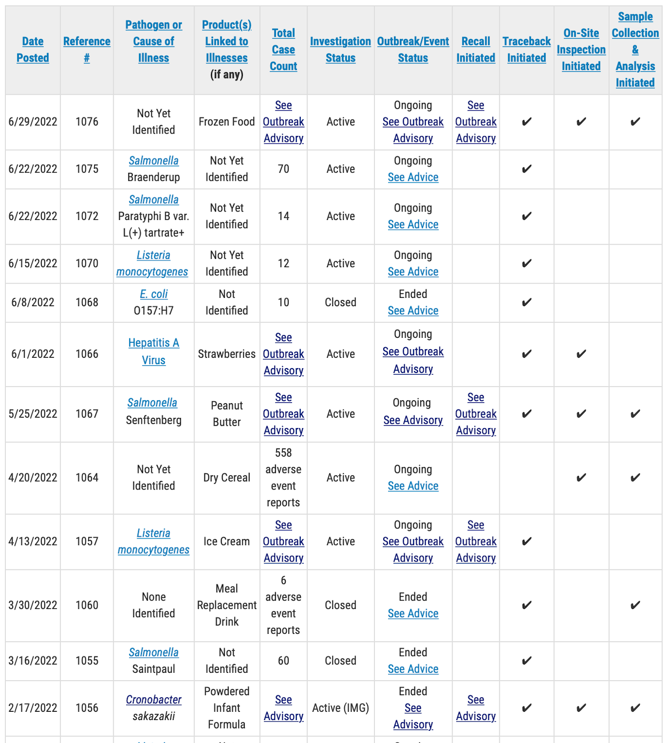 A public health advisory will be issued for investigations that have resulted in specific, actionable steps for consumers to take to protect themselves, according to the FDA. Please direct your attention to those pages for the most up-to-date information on the investigation and for consumer protection information.