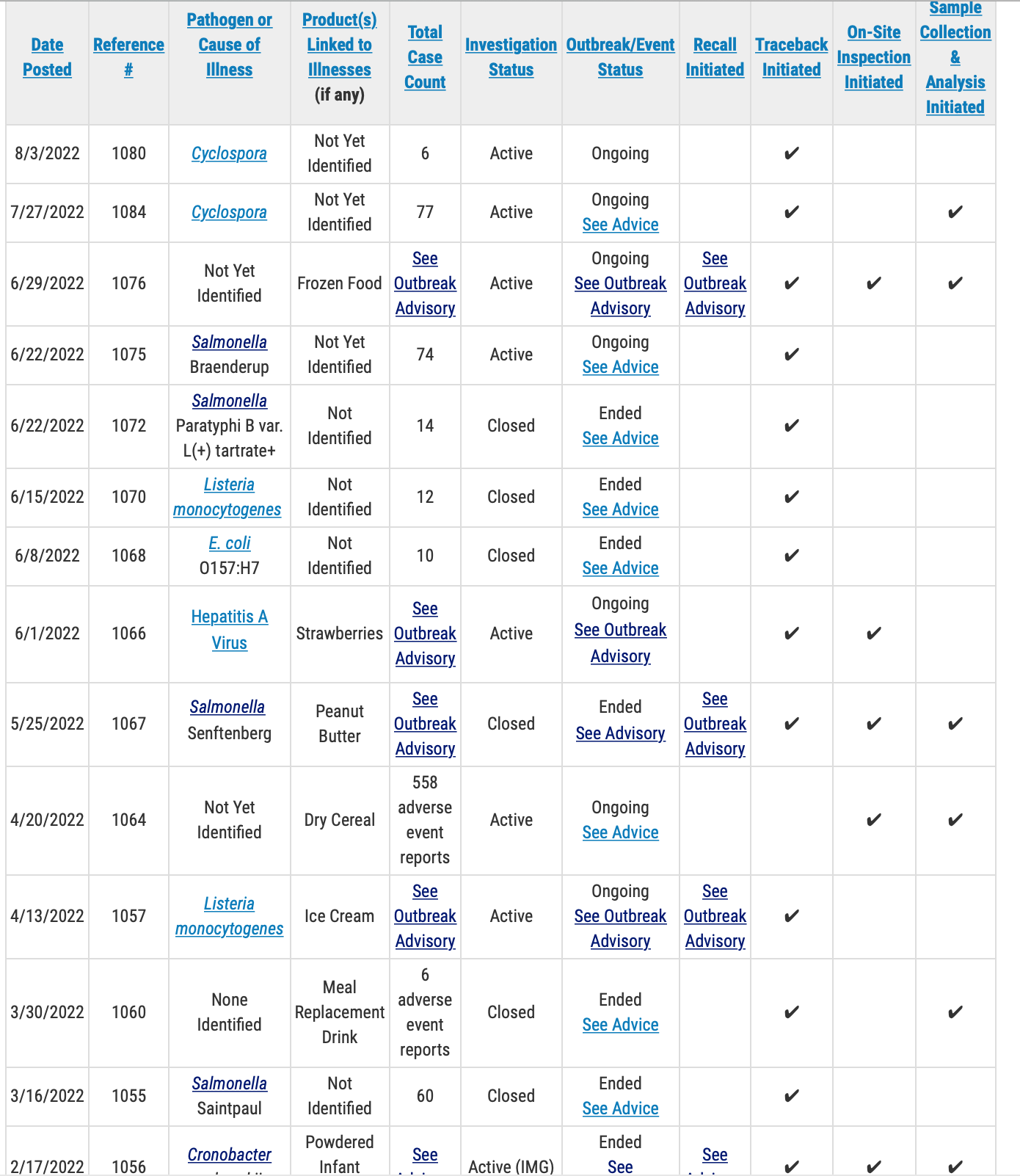 Click on table to enlarge. To view the FDA page with links to specific outbreak details, click here.