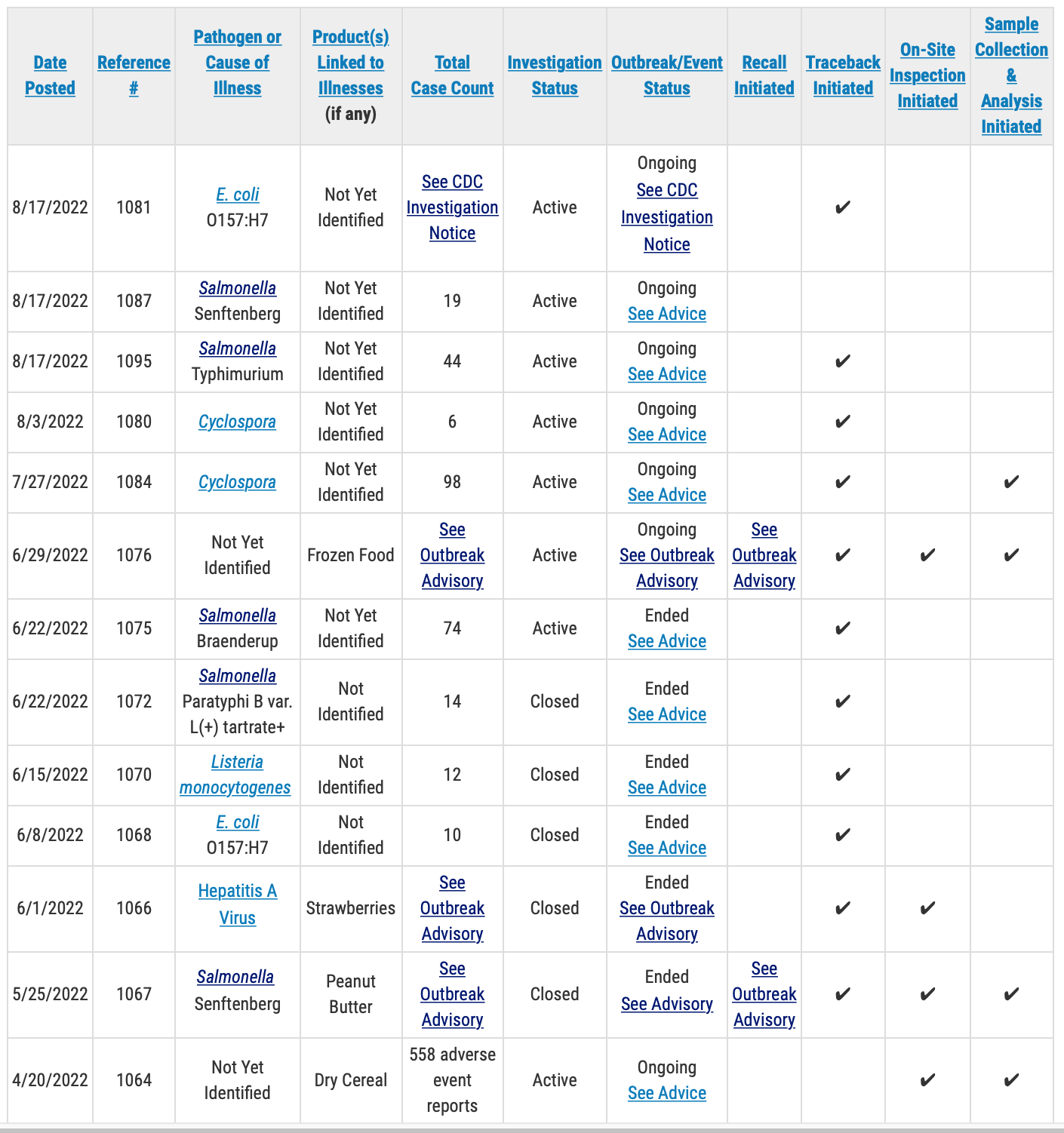 A public health advisory will be issued for investigations that have resulted in specific, actionable steps for consumers to take to protect themselves, according to the FDA. Please direct your attention to those pages for the most up-to-date information on the investigation and for consumer protection information.
