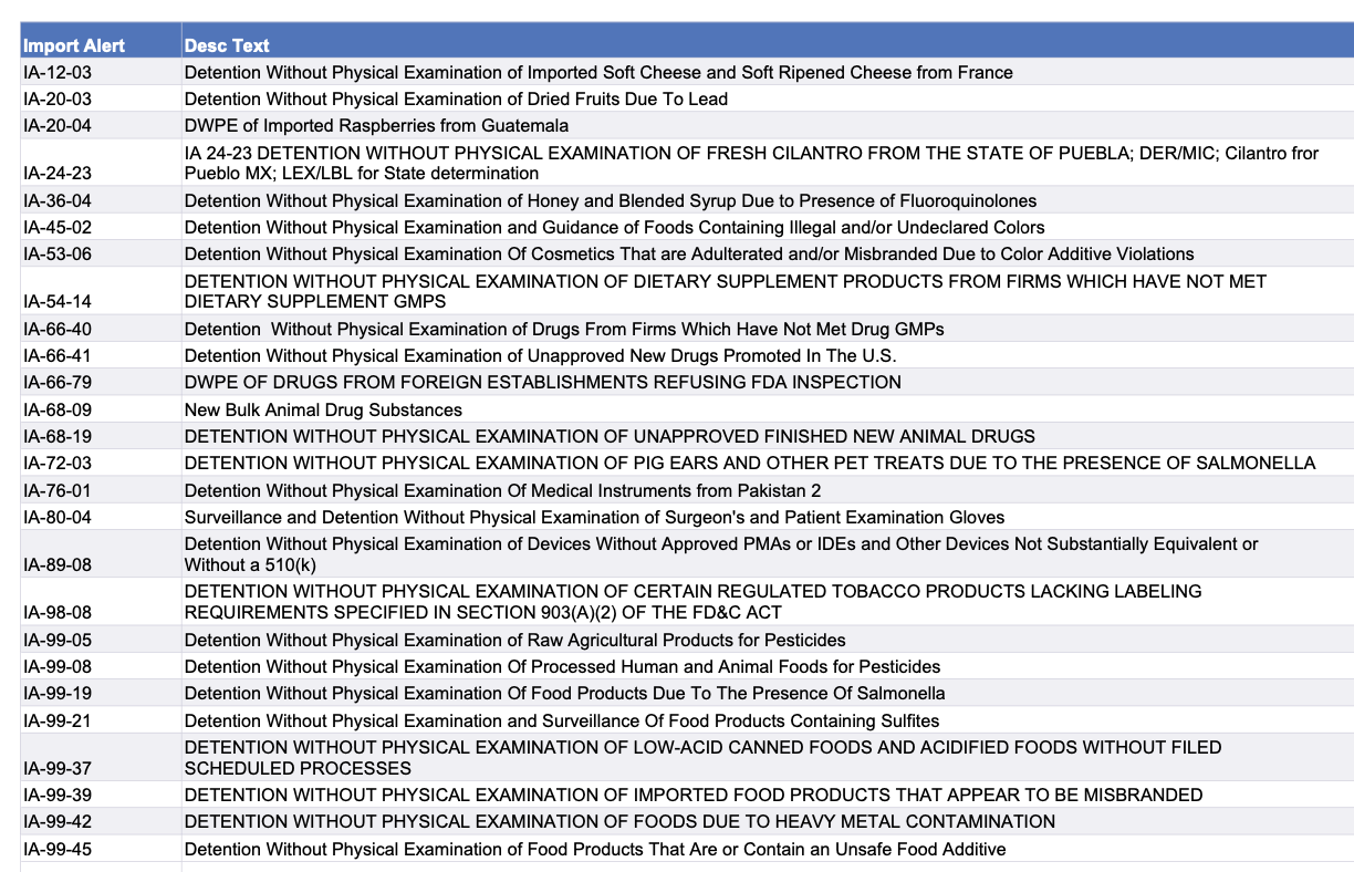 Recent modifications to FDA’s import alerts, as posted by the agency, are listed below. Click here to go to the FDA page with links to details on specific alerts.