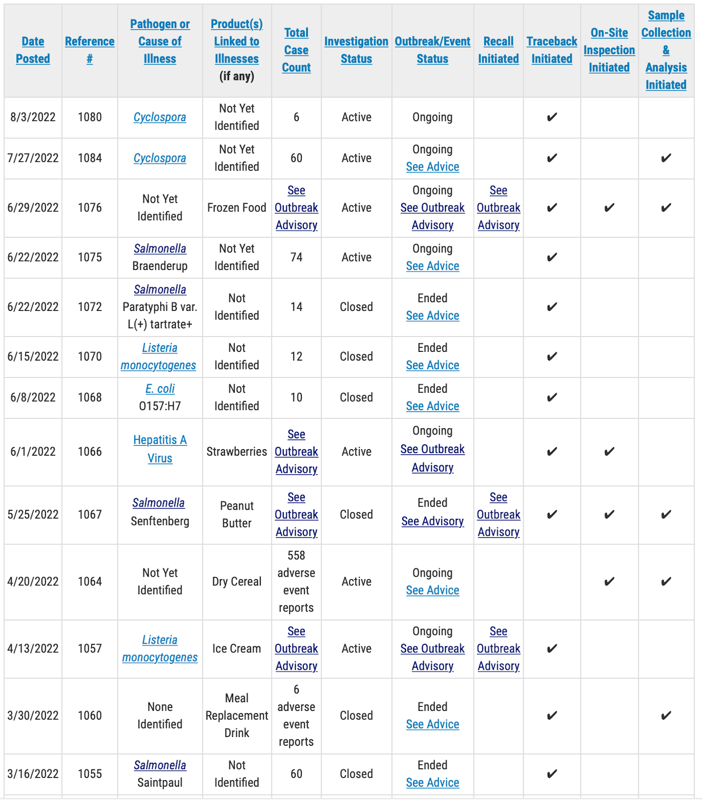 - An investigation related to adverse effects associated with Daily Harvest brand frozen Leeks & Lentils Crumbles. The company has received more than 470 complaints of illnesses and as of July 29 the FDA had received 329 complaints. Some of the patients have gone into liver failure and at least 25 have had to have their gallbladders removed. The FDA is working on traceback efforts and has begun on-site inspection and product testing.