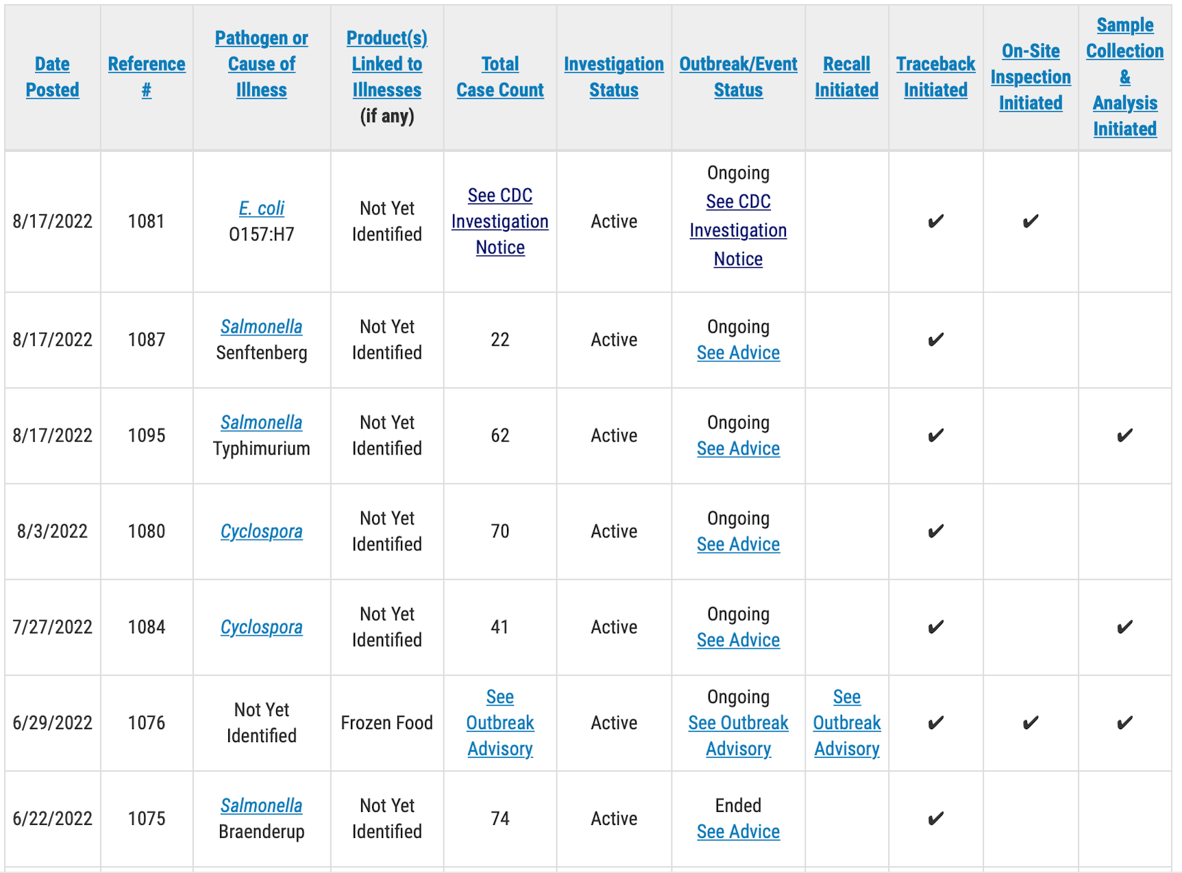 A public health advisory will be issued for investigations that have resulted in specific, actionable steps for consumers to take to protect themselves, according to the FDA. Please direct your attention to those pages for the most up-to-date information on the investigation and for consumer protection information.