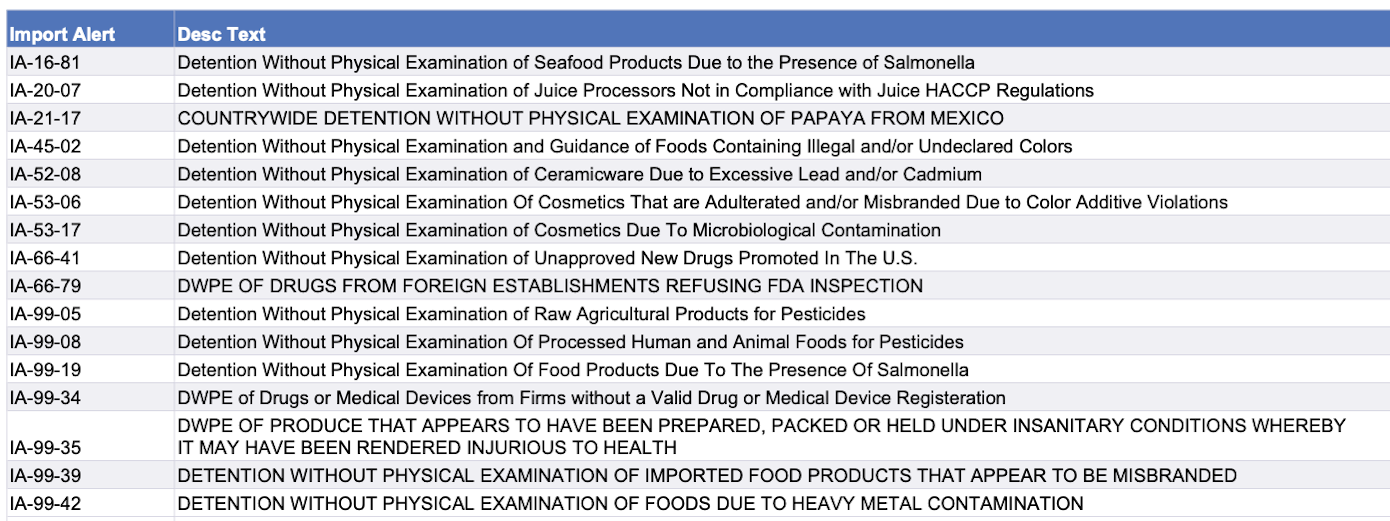 Recent modifications to FDA’s import alerts, as posted by the agency, are listed below.