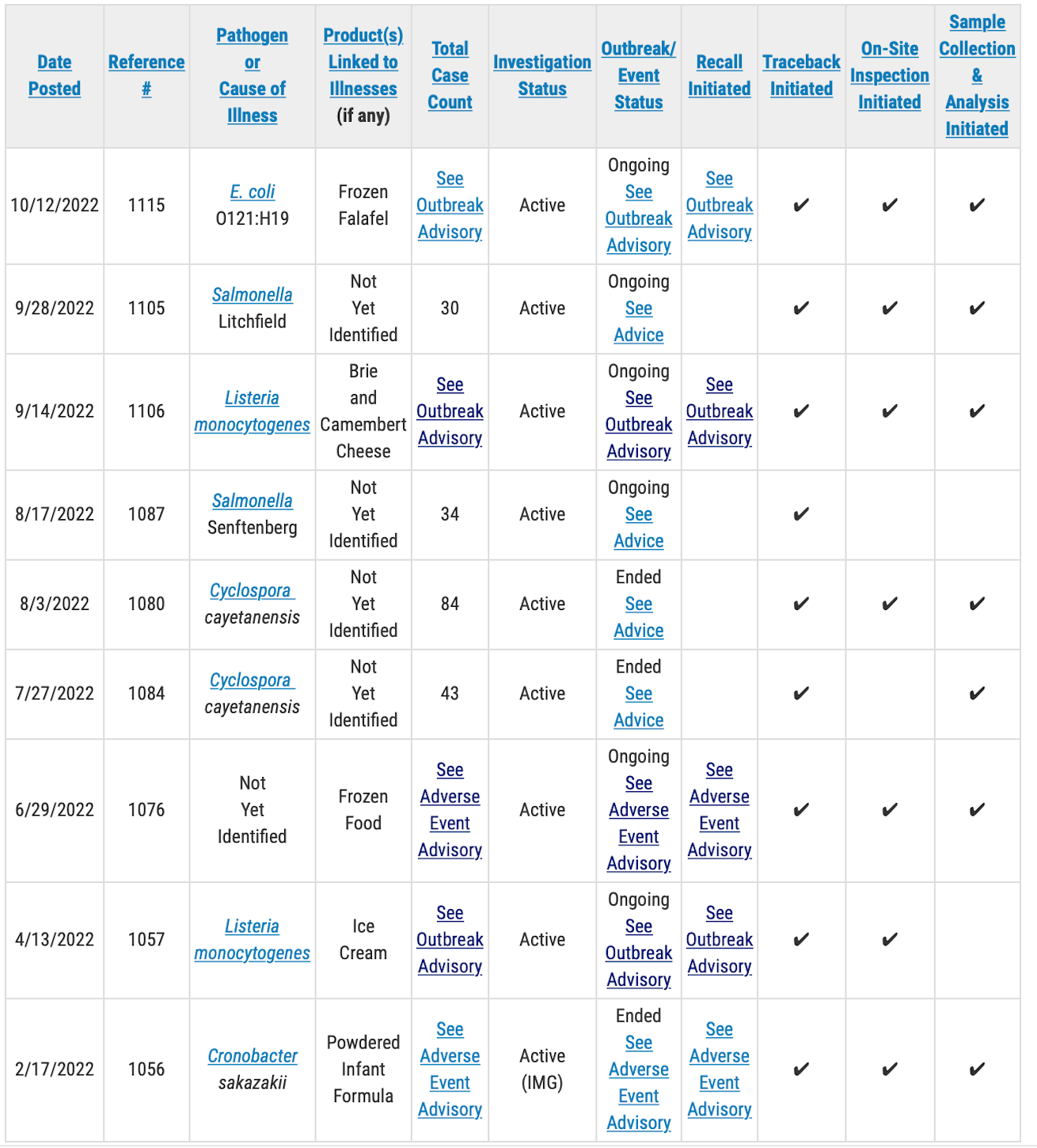 A public health advisory will be issued for investigations that have resulted in specific, actionable steps for consumers to take to protect themselves, according to the FDA. Please direct your attention to those pages for the most up-to-date information on the investigation and for consumer protection information.