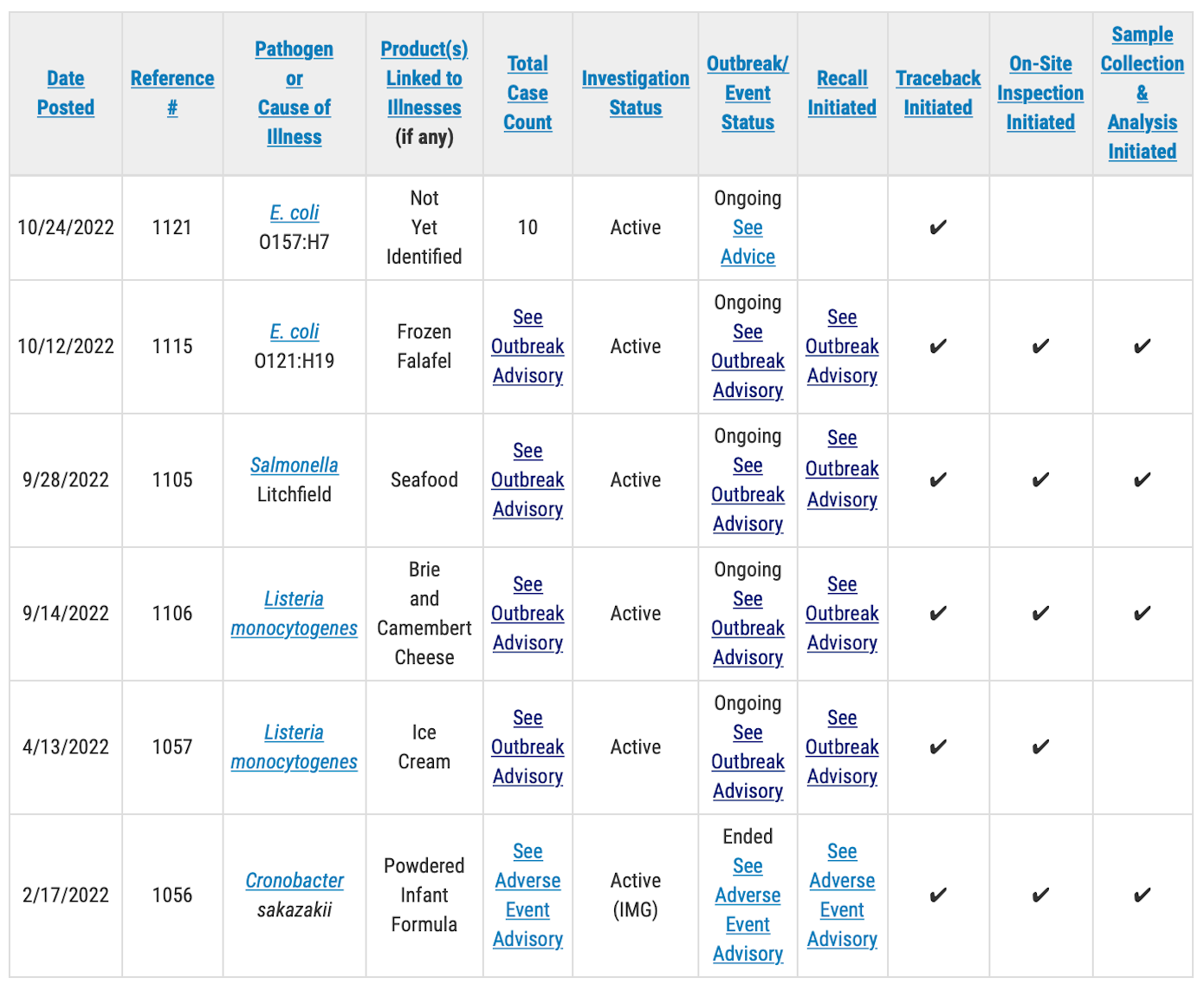 - An outbreak of infections from Cronobacter in at least four infants, two of whom died. The outbreak has been determined to be over by the CDC but is it still under investigation. The babies consumed infant formula made by Abbott Nutrition’s plant in Sturgis, MI.
