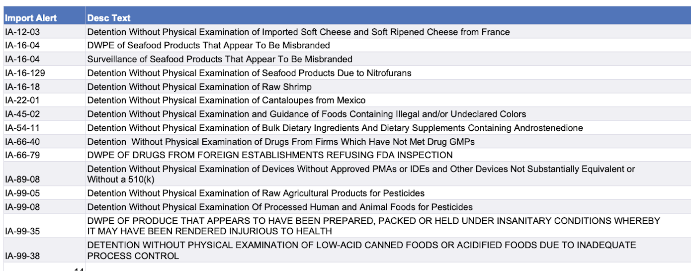 Click on table to enlarge. Click on link above to go to FDA page with links to specific import alerts.