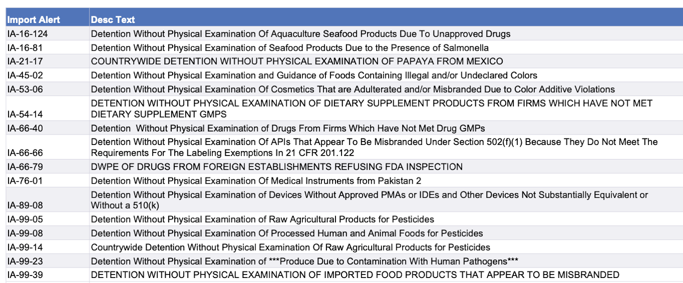 Recent modifications to FDA’s import alerts, as posted by the agency, are listed below.