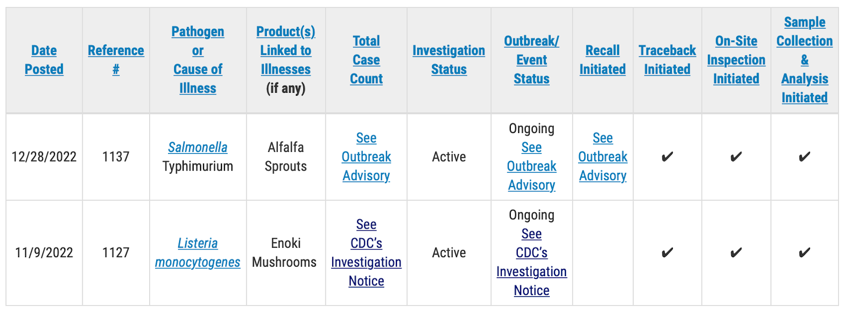 Click here to go to the FDA page with links to specific outbreak details. The investigations are in a variety of stages. Some outbreaks have limited information with active investigations ongoing, others may be near completion.