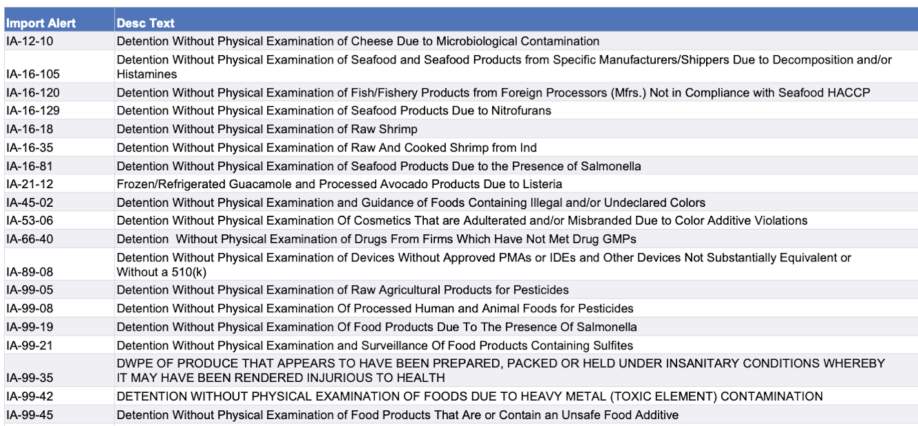Recent modifications to FDA’s import alerts, as posted by the agency, are listed below.