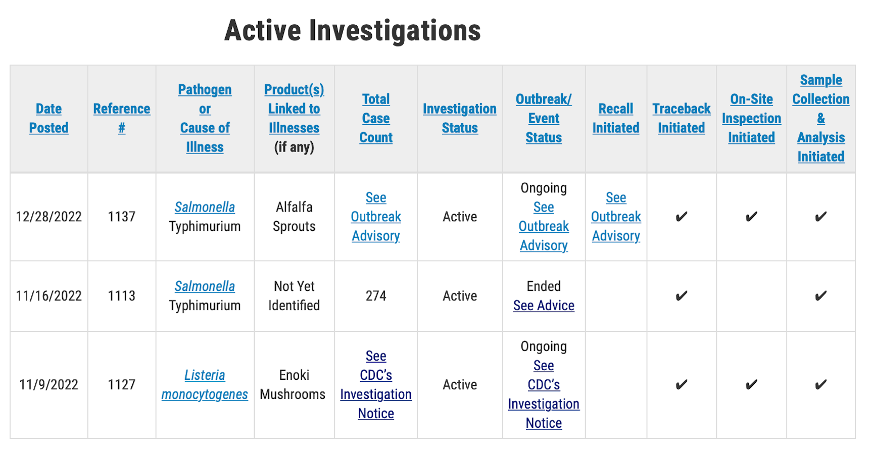 Click here to go to the FDA page with links to specific outbreak details. The investigations are in a variety of stages. Some outbreaks have limited information with active investigations ongoing, others may be near completion.