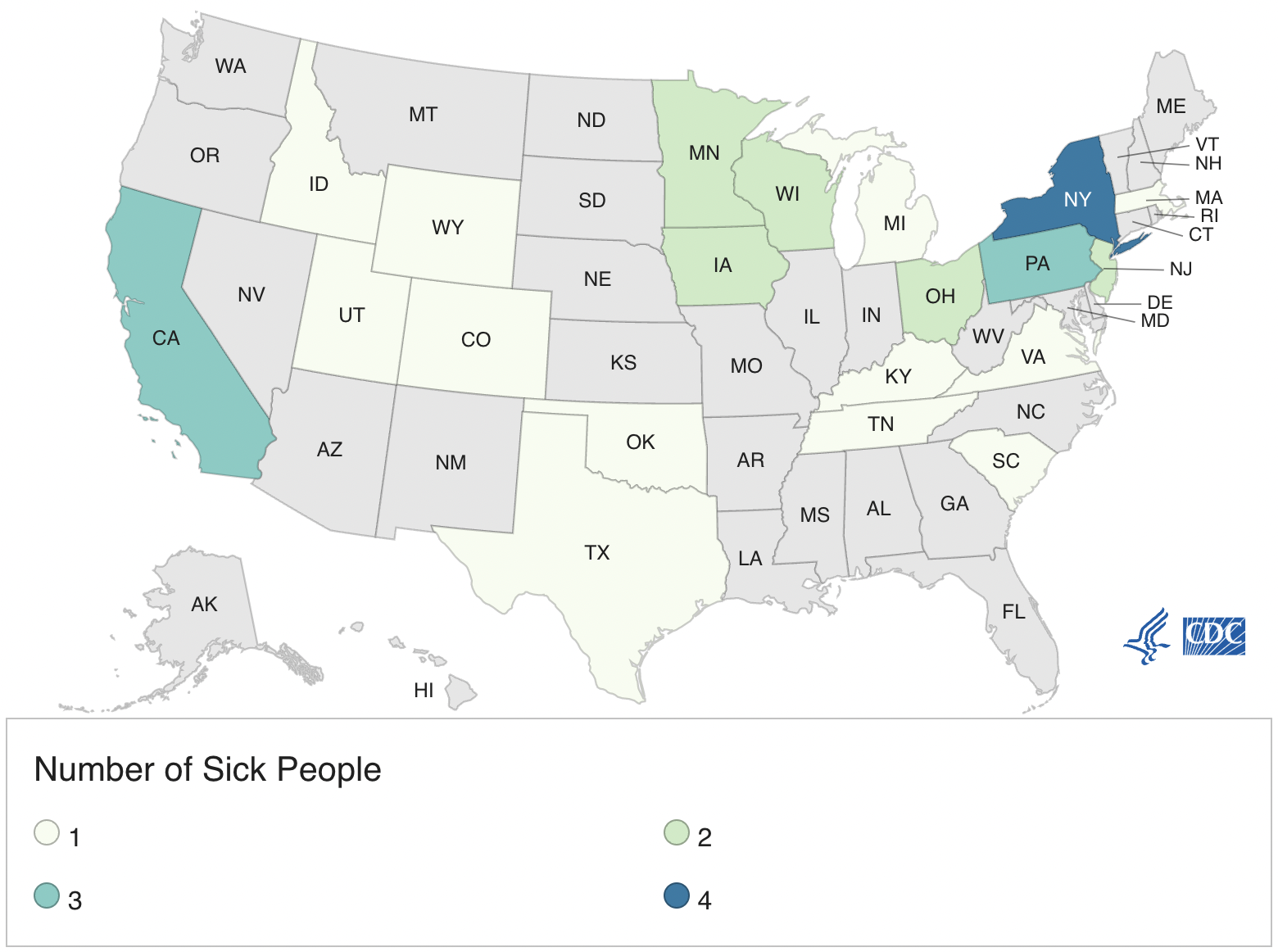 Illnesses have been reported from 20 states. Of the 24 illnesses with information available, 10 have required hospitalizations. Sick people range in age from less than 1 to 75 years. Eleven of the patients are younger than 1 year old and 15 are children under 5. No deaths have been reported.