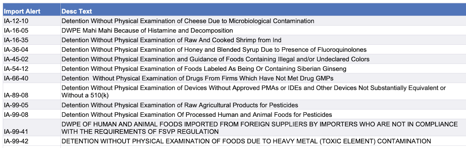 Recent modifications to FDA’s import alerts, as posted by the agency, are listed below.