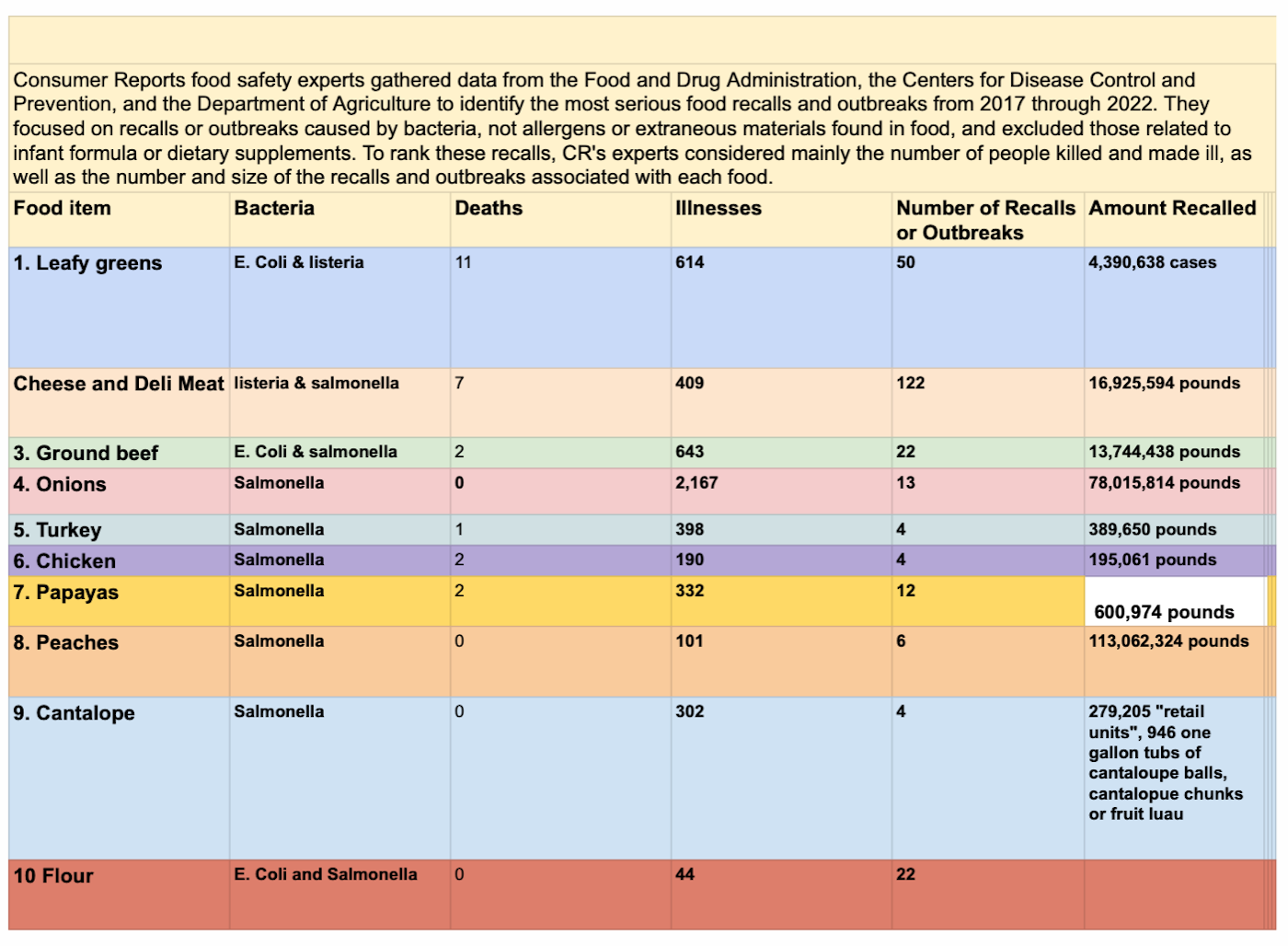 The list was compiled after the organization looked at data from 2017 through 2022. The researchers focused on widely consumed foods that had recalls during the study period. They did not include recalled food related to allergens or extraneous materials. The report ranked recalls based on how many people died or became ill, as well as how widespread the outbreaks were and how many times a food was recalled.