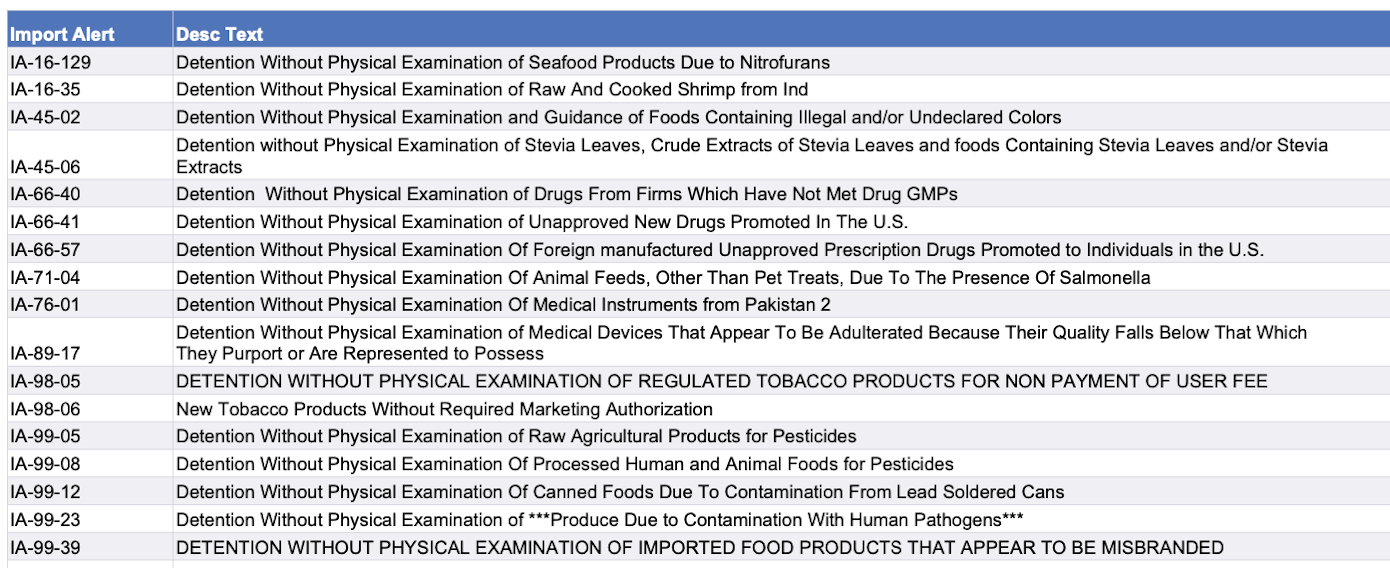Recent modifications to FDA’s import alerts, as posted by the agency, are listed below.