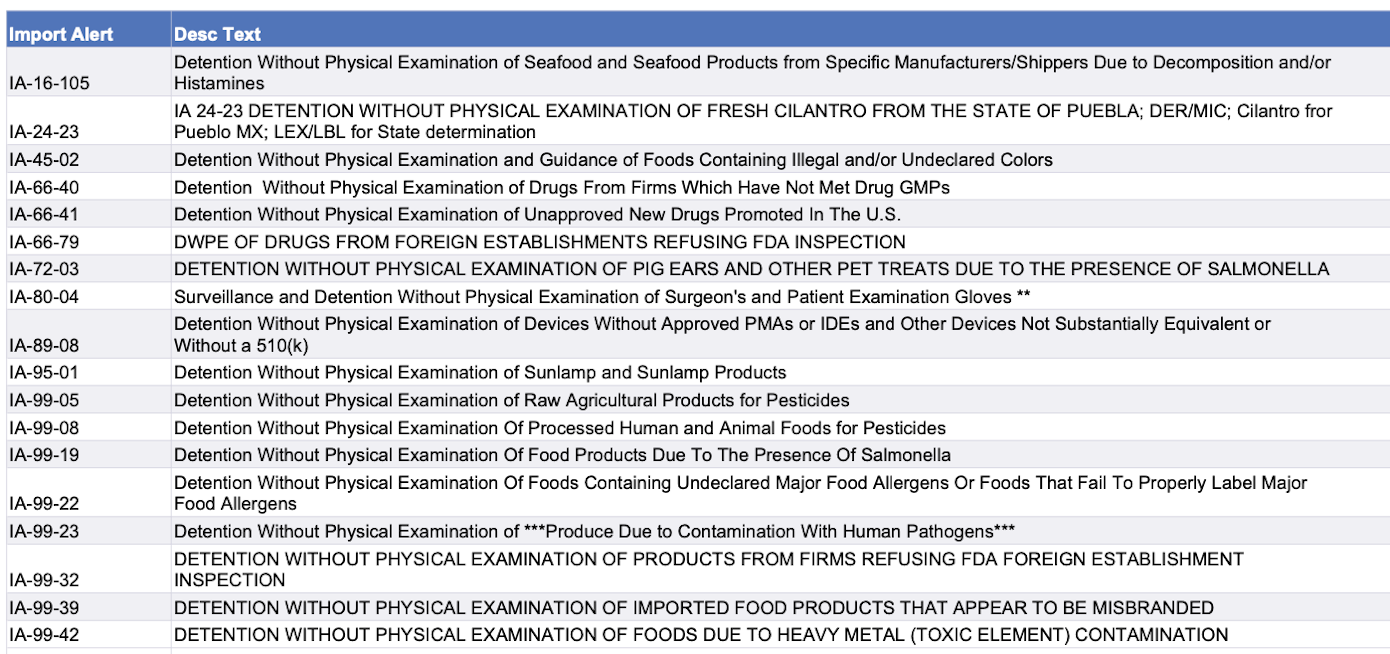 Recent modifications to FDA’s import alerts, as posted by the agency, are listed below.