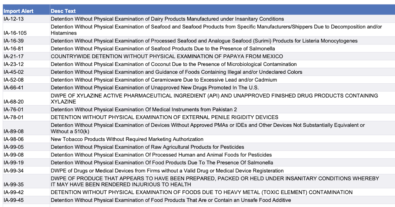 Recent modifications to FDA’s import alerts, as posted by the agency, are listed below.