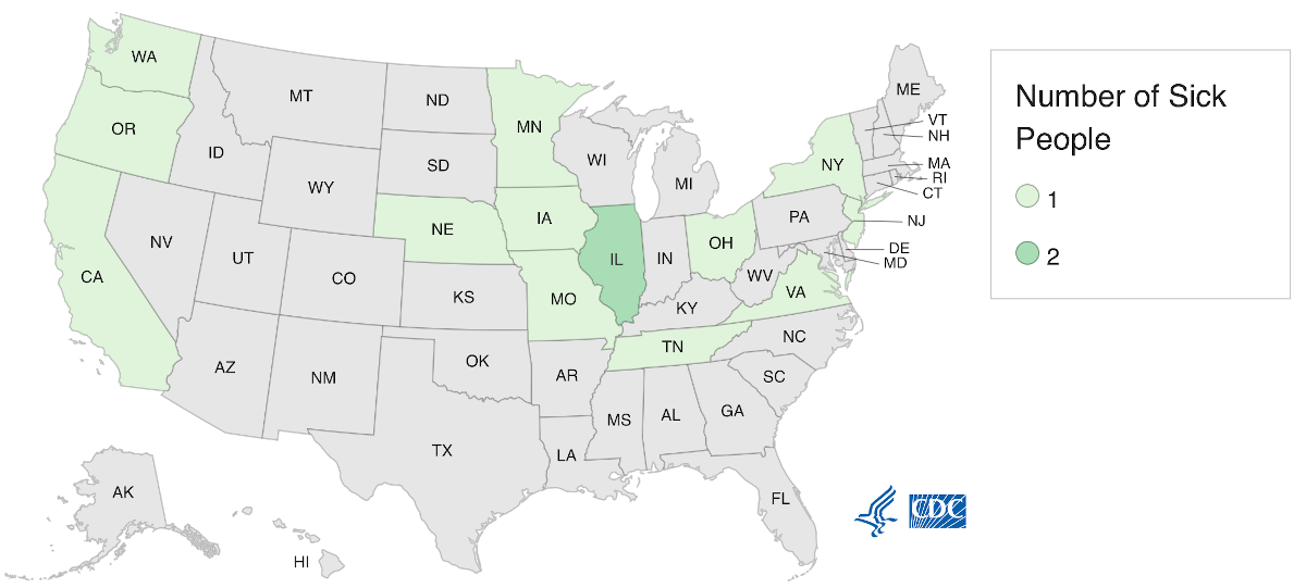 A total of 14 people were confirmed as patients in the outbreak. They lived in 13 states and three required hospitalization. Illnesses started on dates ranging from December 6, 2022, to May 2, 2023. Sick people range in age from 12 to 81 years of age and 92 percent of them are women, according to the Centers for Disease Control and Prevention.