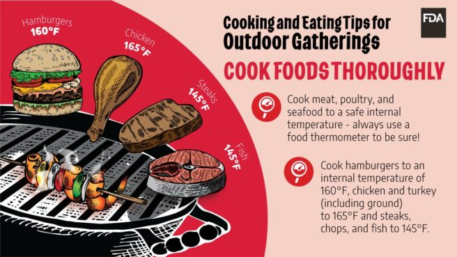The USDA emphasizes the necessity of using a food thermometer to accurately determine if the food is safe to consume. “You can’t tell by looking at food whether it is done.” This device should be inserted into the thickest part of the meat or poultry, or through the side of burgers and thin filets of fish for precise temperature readings.