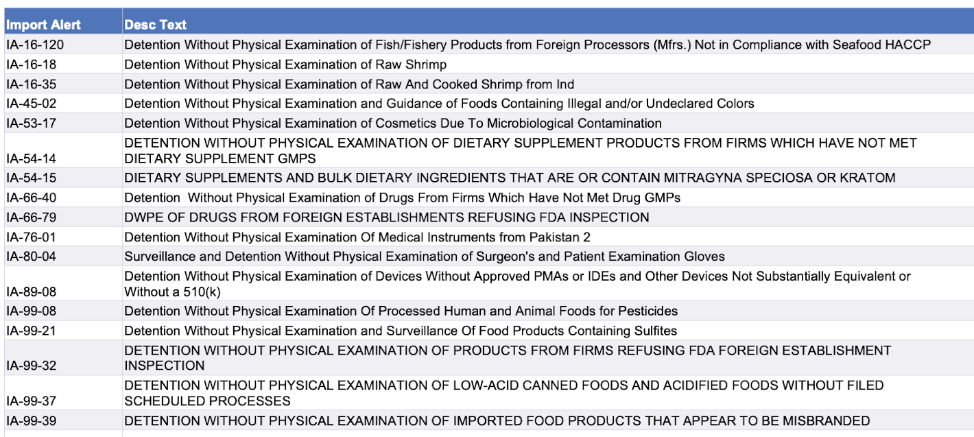 Recent modifications to FDA’s import alerts, as posted by the agency, are listed below.