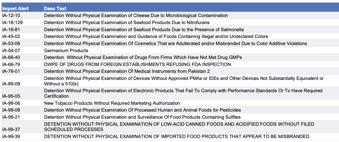 Recent modifications to FDA’s import alerts, as posted by the agency, are listed below.
