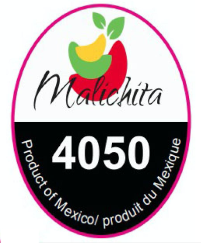 The Cantaloupes are packaged in cardboard containers bearing the Malichita label. The cantaloupes also have an individual PLU sticker placed upon each cantaloupe. The PLU sticker has a top half which is white which has the word “Malichita” written in script in black letters. The bottom of the PLU sticker is black and has the number “4050” prominently displayed in white letters together with the words “Product of Mexico/produit du Mexique.” This label will identify individual Malichita cantaloupes purchased by consumers.