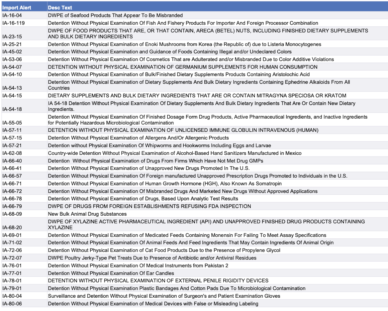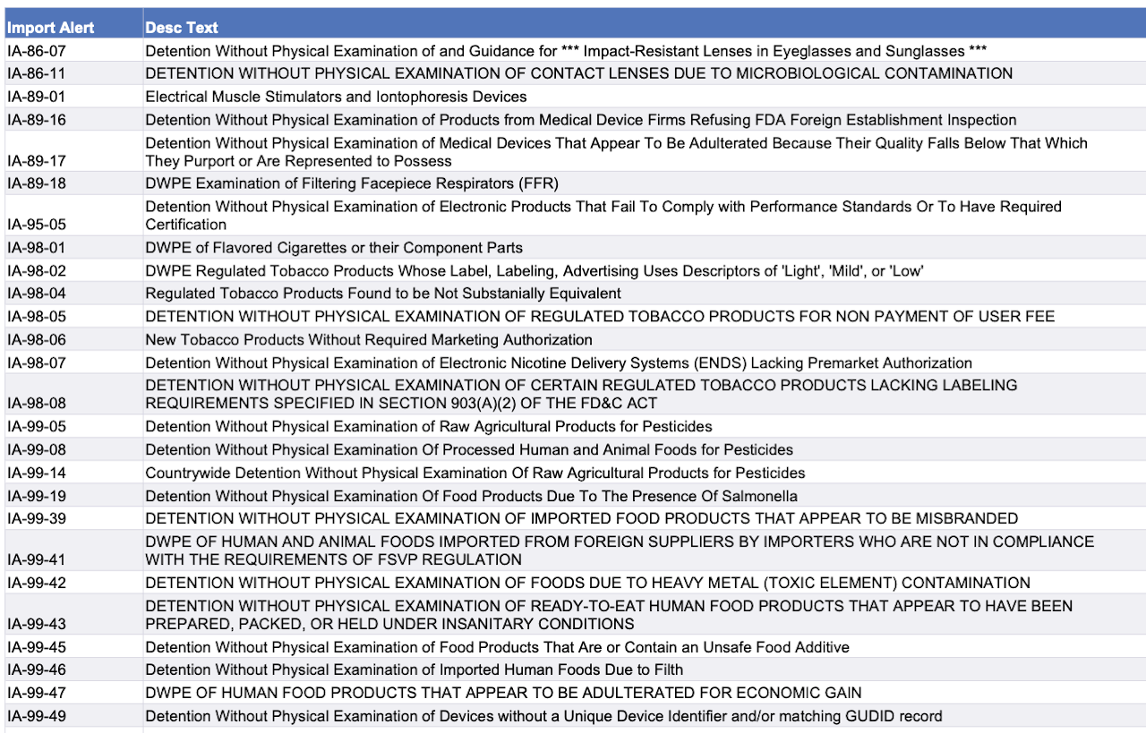 Recent modifications to FDA’s import alerts, as posted by the agency, are listed below.