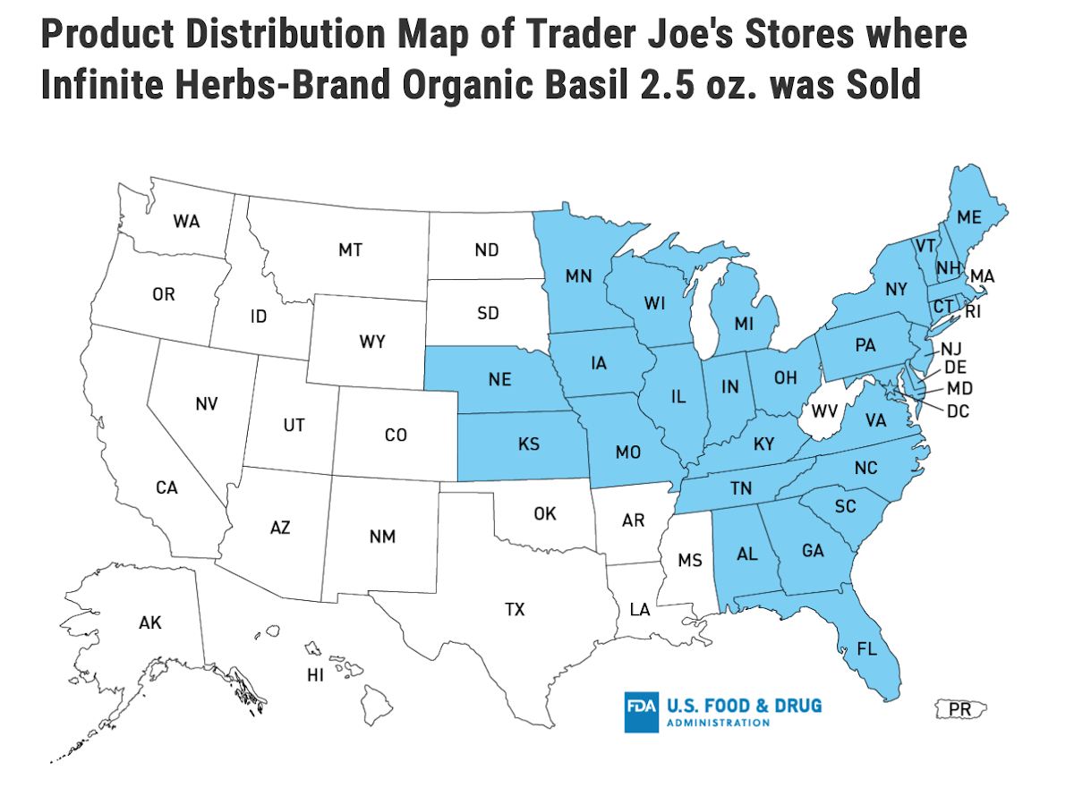 Traceback data collected by the FDA determined that Infinite Herbs LLC, in Miami, FL, was the supplier of the 2.5-ounce packages of organic basil sold at Trader Joe’s stores.