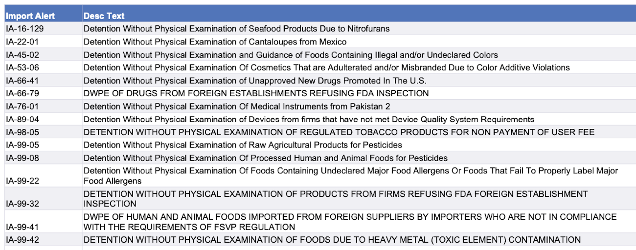 Recent modifications to FDA’s import alerts, as posted by the agency, are listed below.