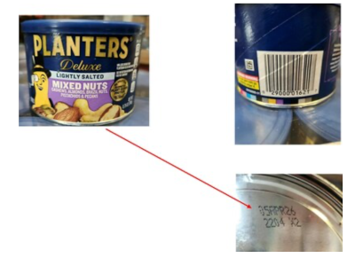 The recalled product is limited to 4-ounce packages of PLANTERS Honey Roasted Peanuts with a “Best If Used By” date of April 11, 2025, and a package UPC code of 2900002097 and 8.75-ounce cans of PLANTERS Deluxe Lightly Salted Mixed Nuts with a “Best If Used By” date of April 5, 2026 and a package UPC code of 2900001621 on the side of the can.