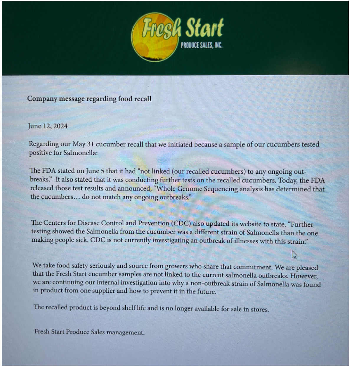 As part of the Salmonella Africana investigation, state partners in the Pennsylvania Department of Agriculture collected samples of cucumbers from several retail locations in their state. One sample supplied by Fresh Start Produce Sales, Inc., of Delray, Florida, tested positive for Salmonella. The specific strain of Salmonella found on Fresh Start Produce Sales, Inc. recalled cucumbers was identified as Salmonella Bareilly and does not match any ongoing outbreaks.