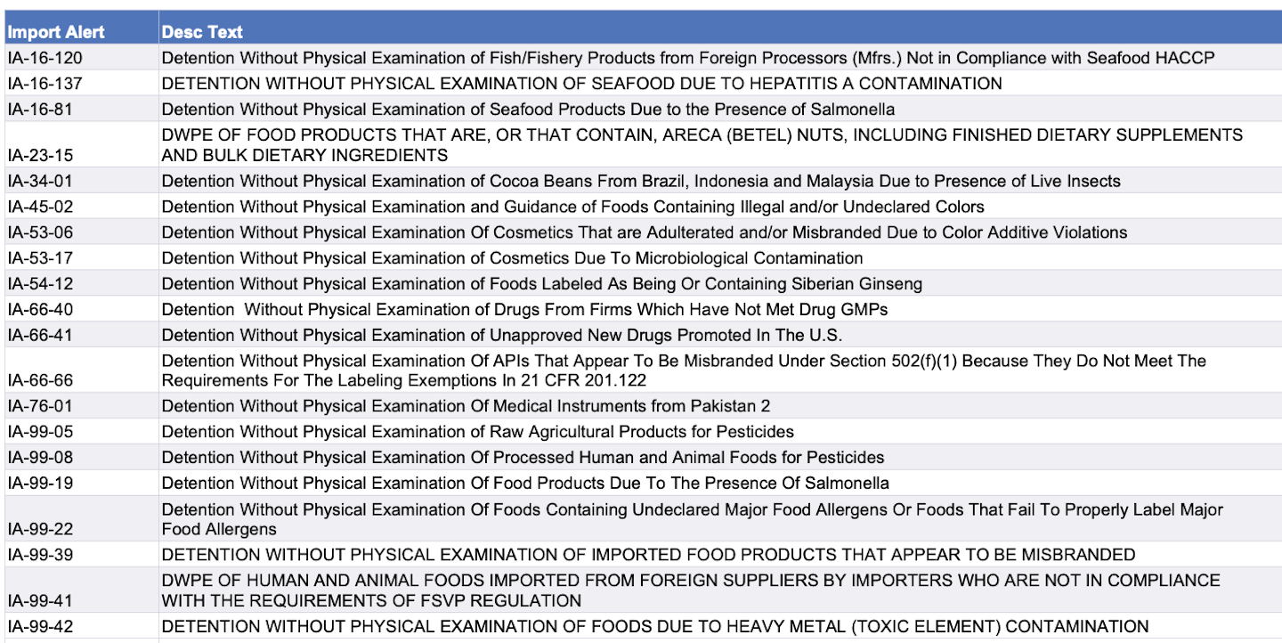 Recent modifications to FDA’s import alerts, as posted by the agency, are listed below.