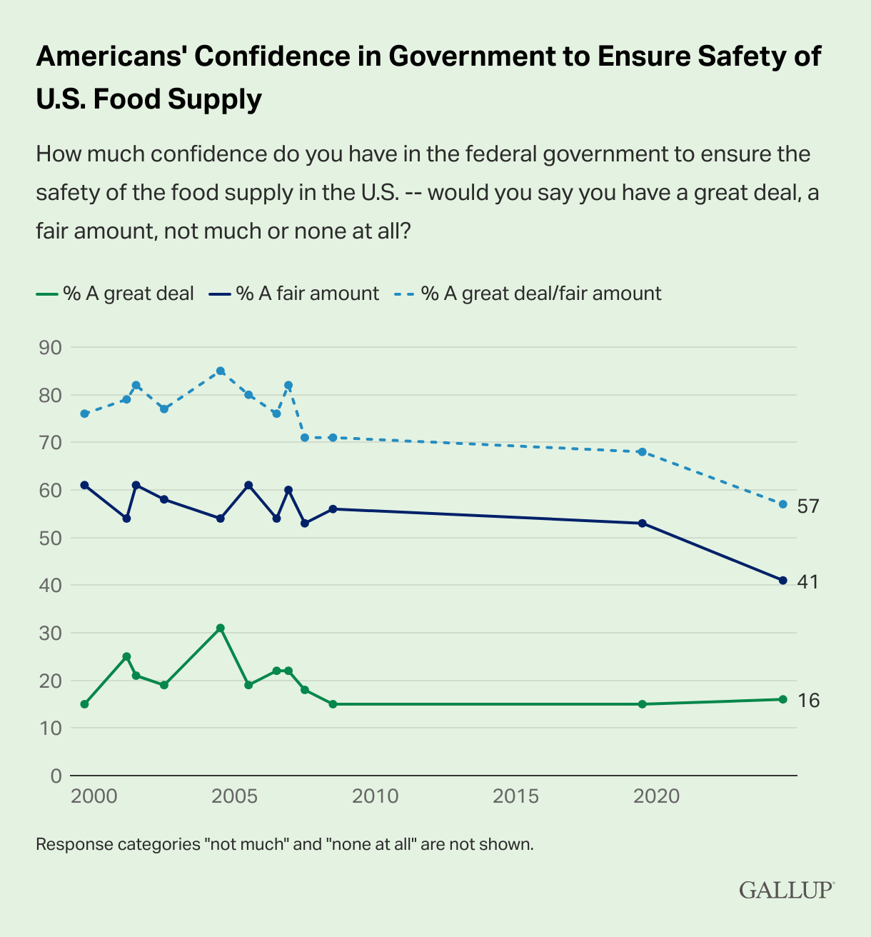 About 57 percent of the U.S. adults who responded said they have a great deal or a fair amount of confidence in the government’s ability to keep the food supply safe. That’s down 11 percentage points compared to Gallup’s reading in 2019.