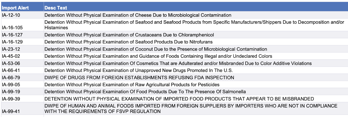 Use chart below to view import alerts. Click here to go to the FDA page with links to details on specific alerts. See chart below for list of alert modifications.