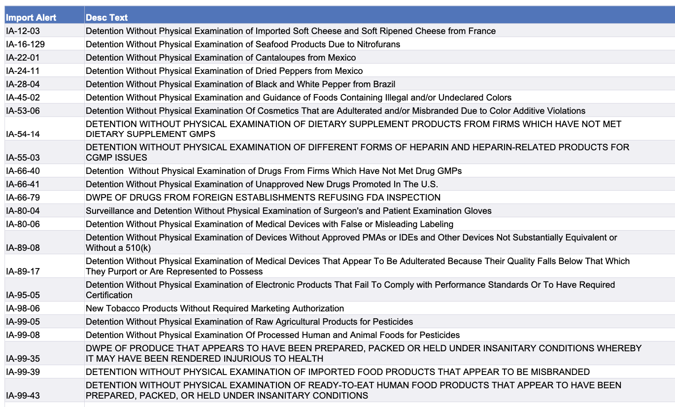 Use chart below to view import alerts. Click here to go to the FDA page with links to details on specific alerts. See chart below for list of alert modifications.