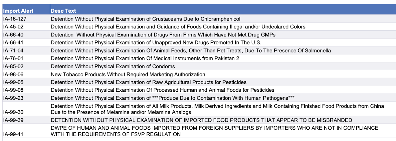 Use the chart below to view import alerts. Click here to go to the FDA page with links to details on specific alerts.