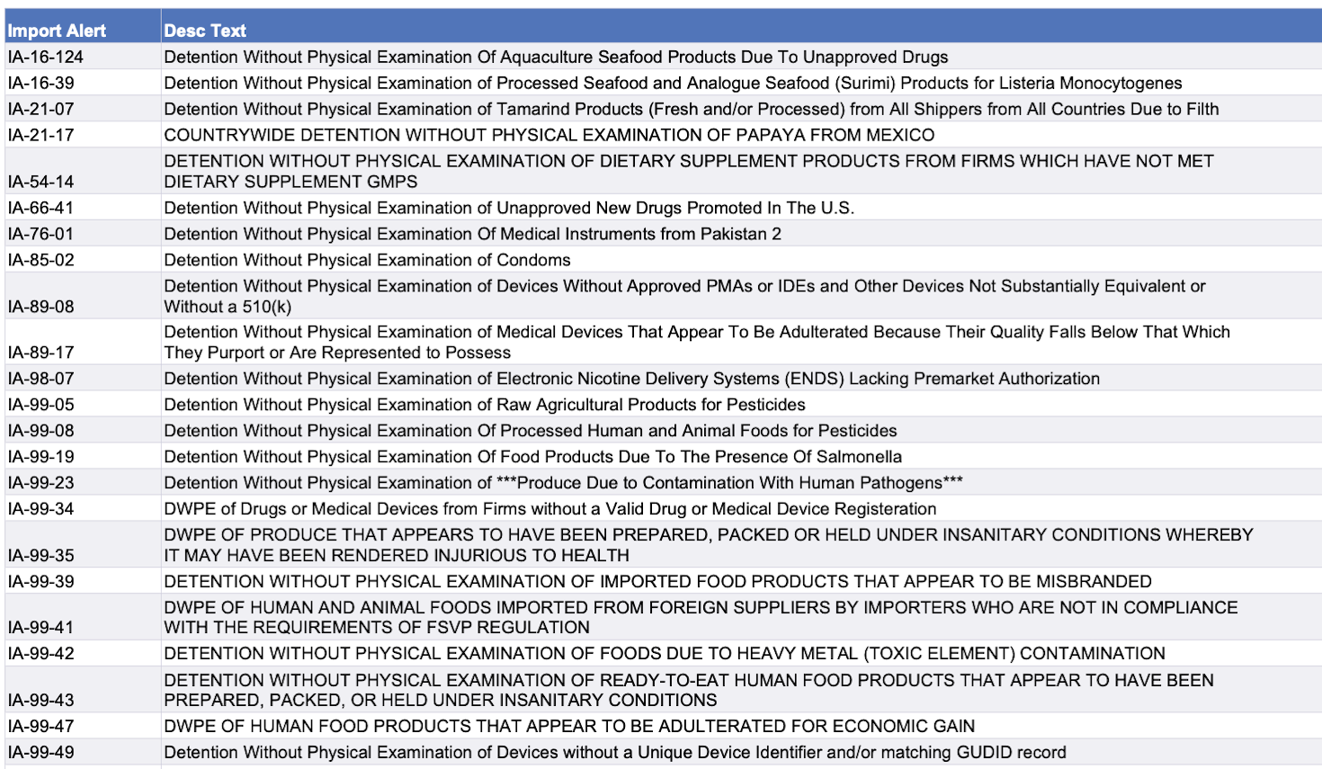 Use the chart below to view import alerts. Click here to go to the FDA page with links to details on specific alerts.