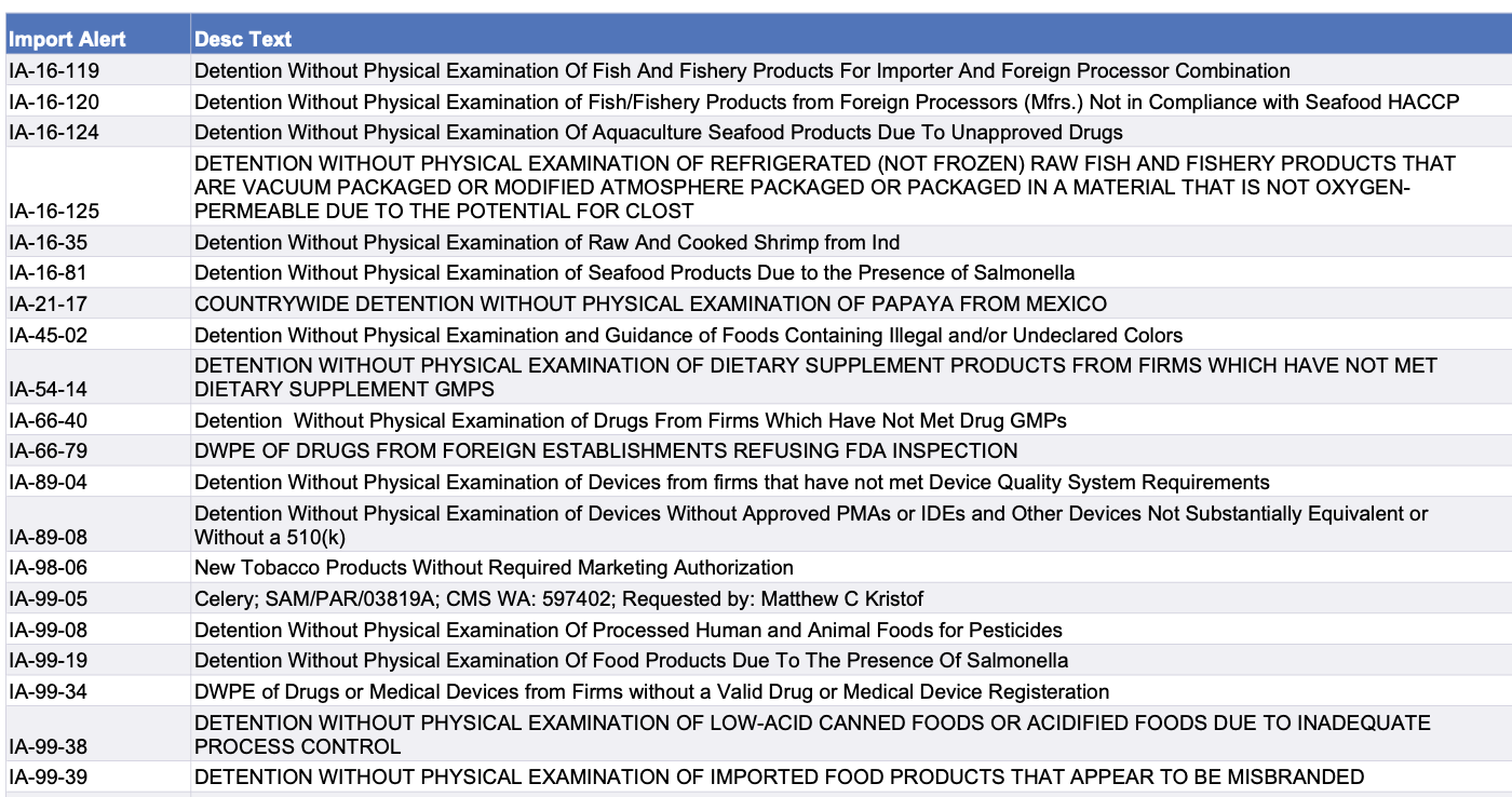 Use the chart below to view import alerts. Click here to go to the FDA page with links to details on specific alerts.