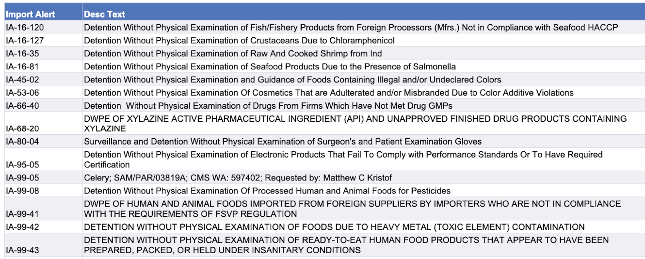 Use the chart below to view import alerts. Click here to go to the FDA page with links to details on specific alerts.