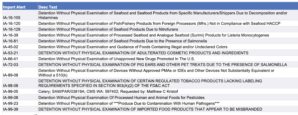 Use the chart below to view import alerts. Click here to go to the FDA page with links to details on specific alerts.