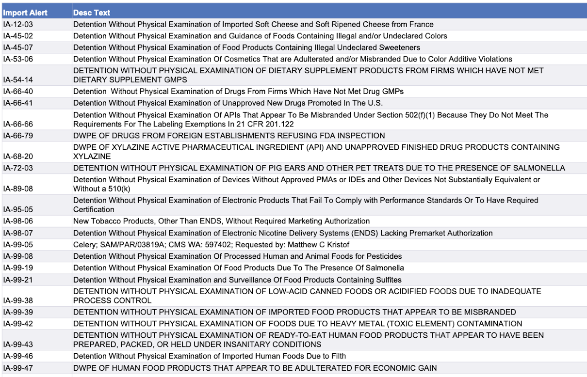 Use the chart below to view import alerts. Click here to go to the FDA page with links to details on specific alerts.