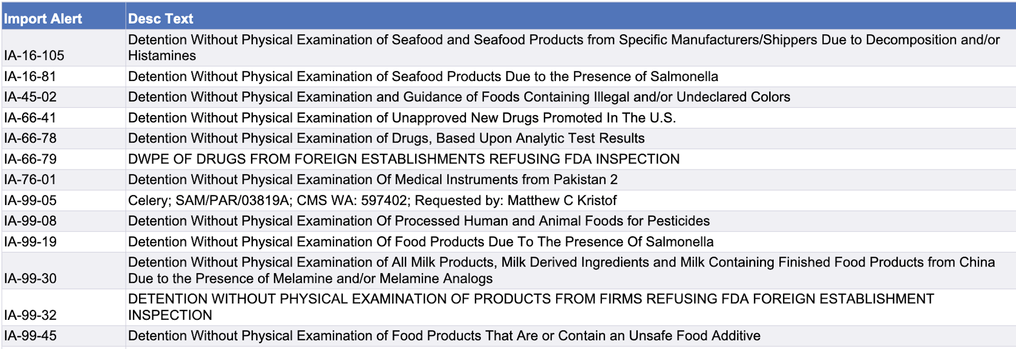 Use the chart below to view import alerts. Click here to go to the FDA page with links to details on specific alerts.