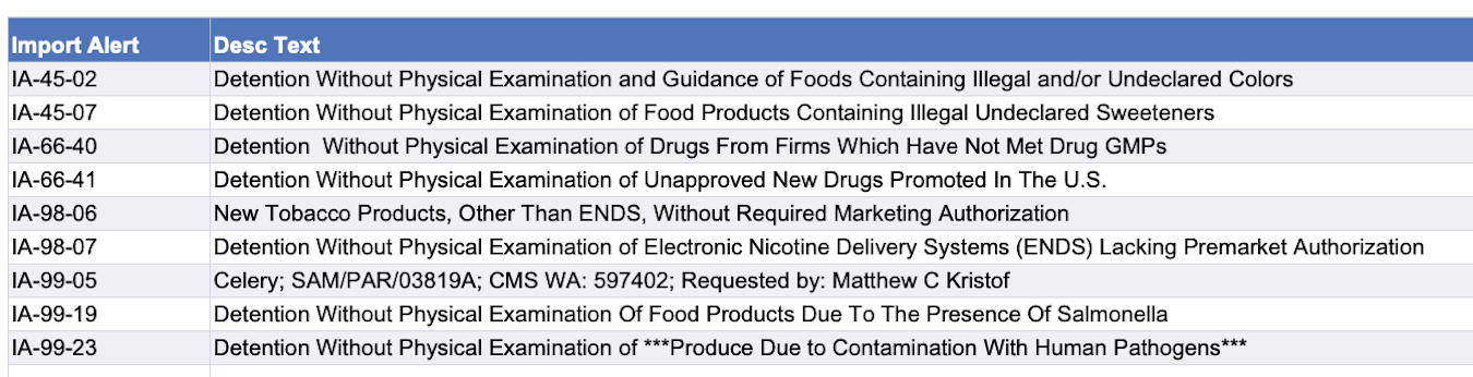 Use the chart below to view import alerts. Click here to go to the FDA page with links to details on specific alerts.