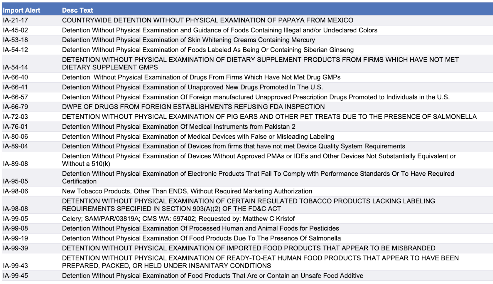 Recent modifications to FDA’s import alerts, as posted by the agency, are listed below.