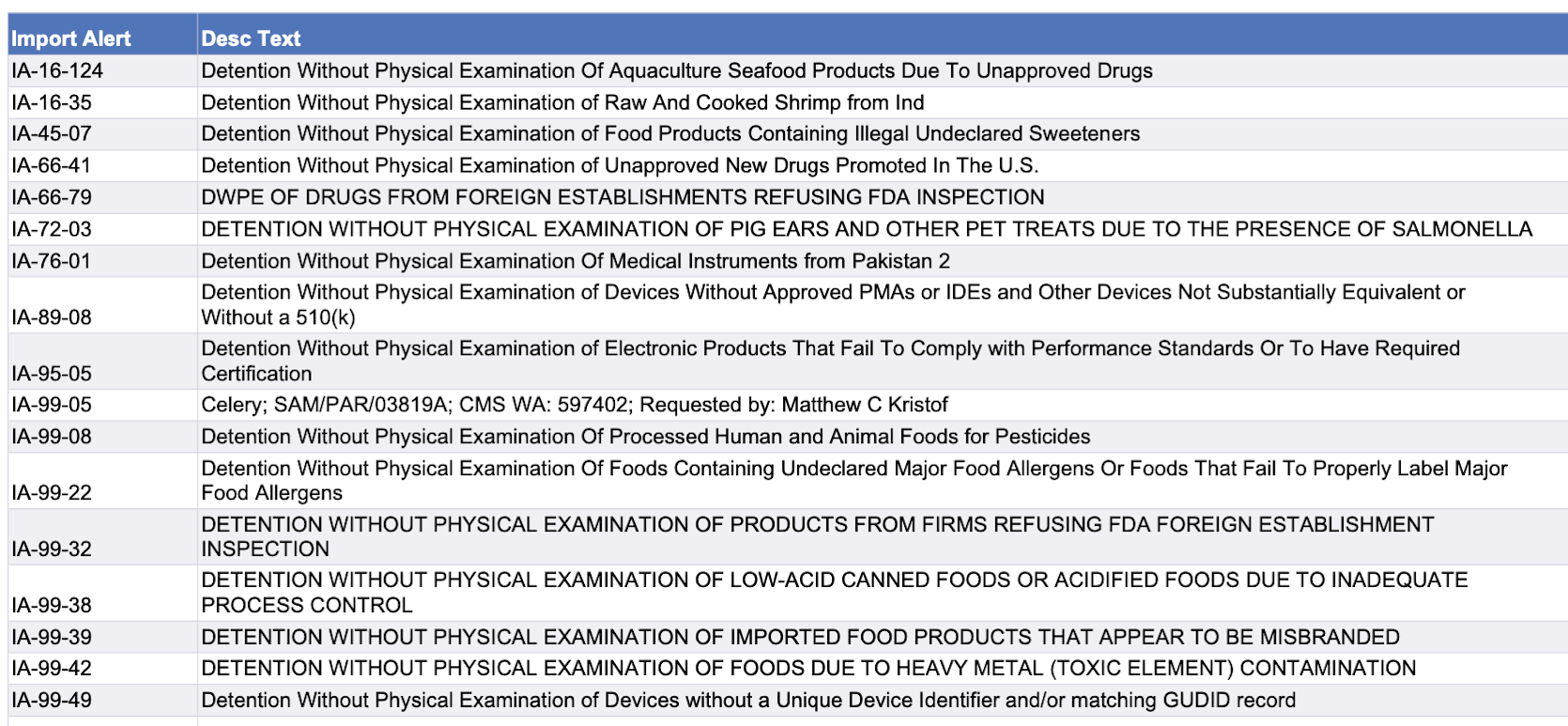 Recent modifications to FDA’s import alerts, as posted by the agency, are listed below.