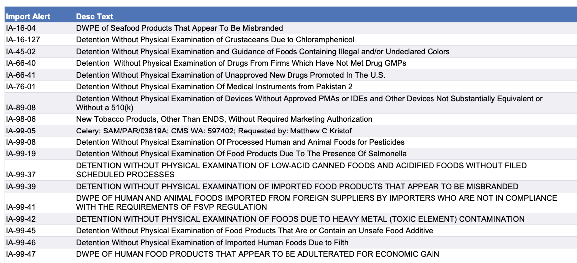 Recent modifications to FDA’s import alerts, as posted by the agency, are listed below.