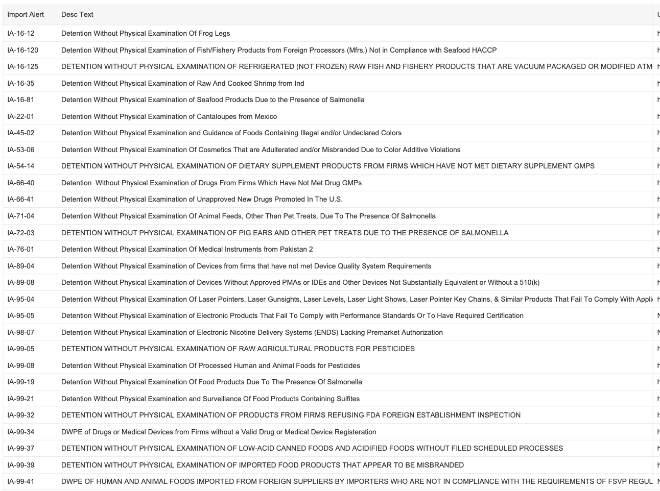 Recent modifications to FDA’s import alerts, as posted by the agency, are listed below.