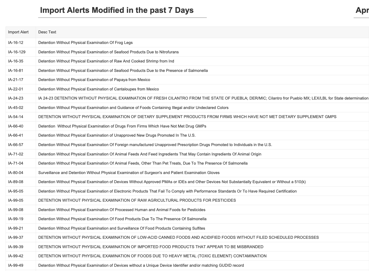 Recent modifications to FDA’s import alerts, as posted by the agency, are listed below.